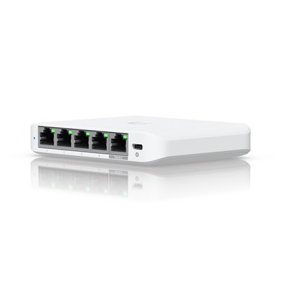 Compact, 5-port 2.5G switch that can be powered with PoE or a USB-C adapter (included).